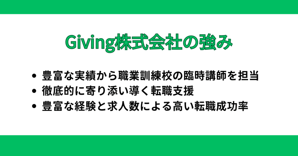 Giving株式会社は、1,000名以上の転職サポート実績と3万件を超える求人数を誇り、これらが相まって高い転職成功率を実現しています。