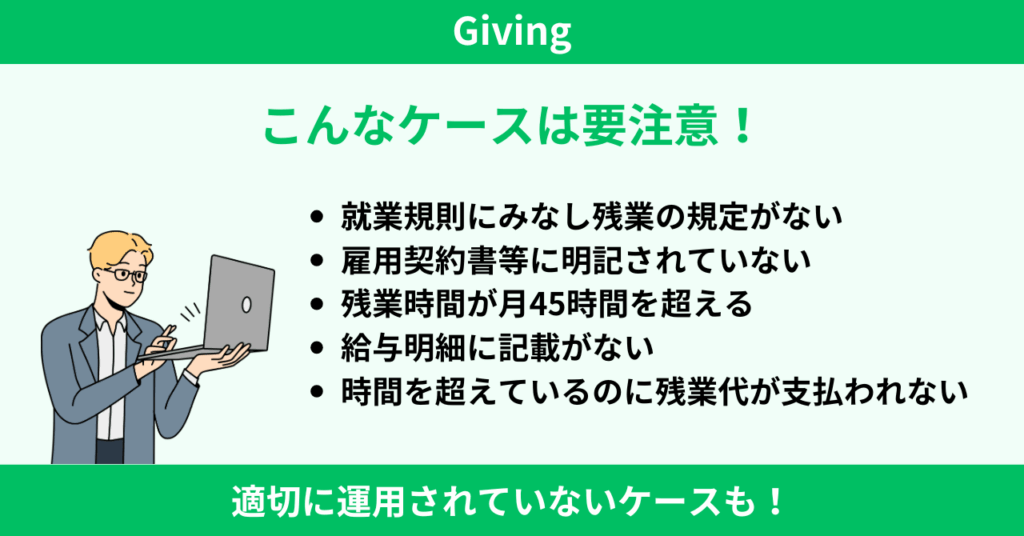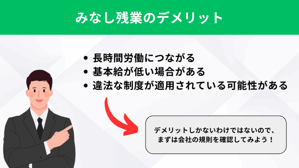 | 残業の固定化 | 残業が「当たり前」という認識が定着する | 「みなし残業分は必ず働くべき」という雰囲気 |