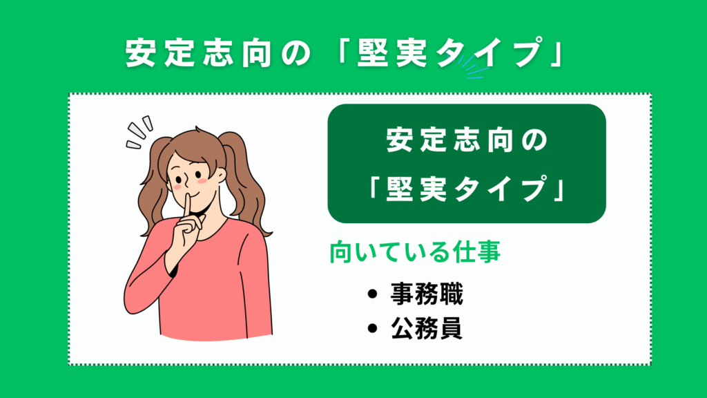 安定志向が強い「堅実タイプ」の人には、長期的に安定した環境で働くことができる、事務職や公務員などの職種が向いています。