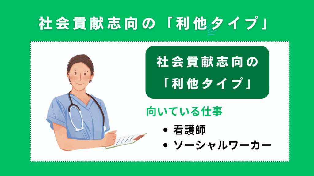 社会貢献志向が強い「利他タイプ」の人には、他者のために働くことに喜びを感じる傾向がある、看護師やソーシャルワーカーなどの職種が向いています。