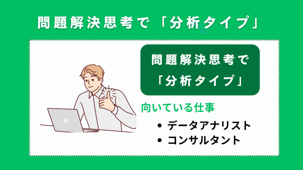 問題解決思考が強い「分析タイプ」の人には、複雑な課題に取り組み、解決策を見出すことに喜びを感じる、データアナリストやコンサルタントなどの職種が向いています。