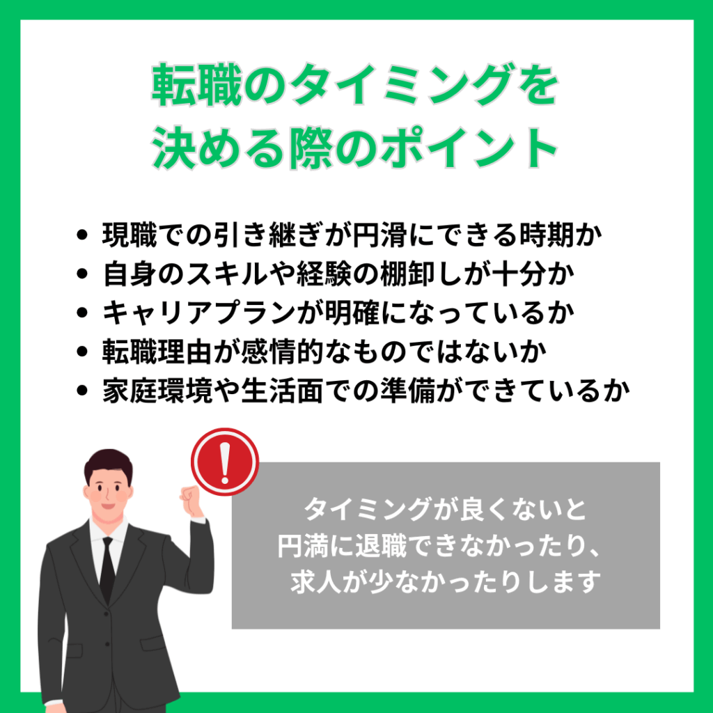 これらのタイミングを避け、自分のキャリアプランやライフプランに合わせて最適な時期を選ぶことが成功への近道です。